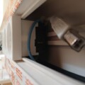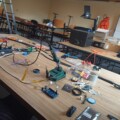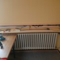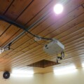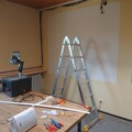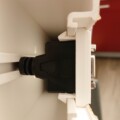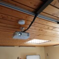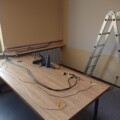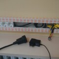 At the height of the left audio box, a power distributor is accessible. This supplies mains voltage for the entire installation. Four consumers are addressed: The projector itself gets a supply line, each of the boxes needs a power connection and finally another power line supplies the control unit (sockets and Arduino).